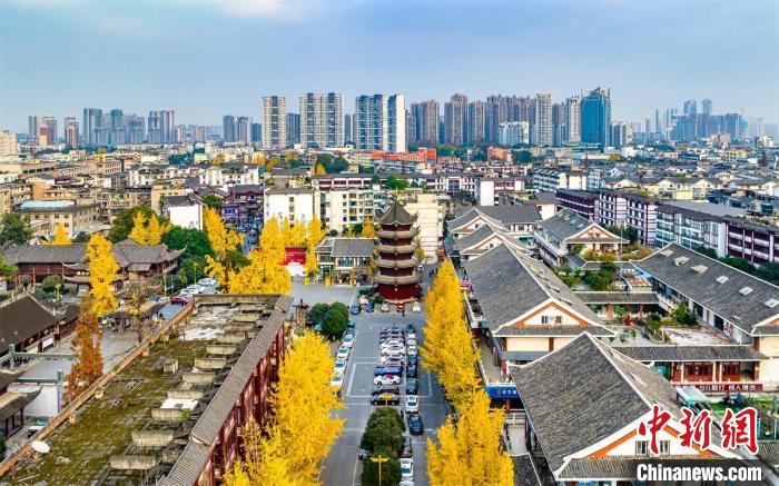 近日,在位于成都市温江区的大南街文庙,又到一年银杏黄,微风拂过,黄叶纷飞,金黄的银杏叶挂满树枝,正是市民拍照打卡好时节,看银杏成了成都市民必不可少的仪式。从航拍的文庙上空看下来,尤为特别,金黄的银杏叶非常耀眼,使整条街道靓丽了许多。众市民沿着文庙,漫步至银杏树下,欣赏美景、拍照打卡。