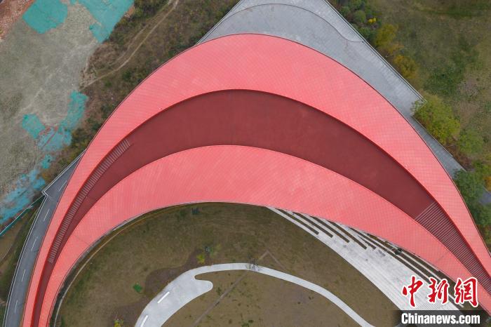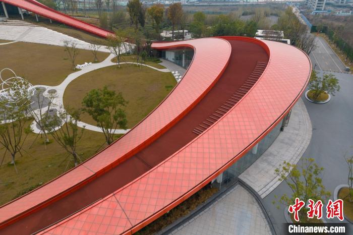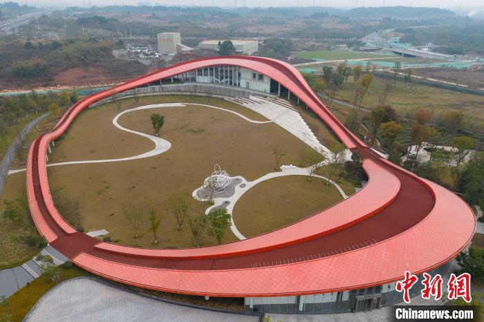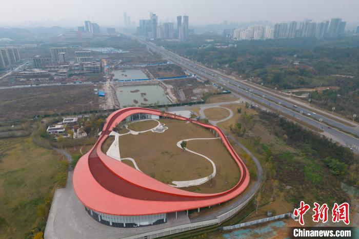 12月19日,四川成都,无人机俯瞰天府新区新地标“智慧之环”,犹如一条红色巨型丝带飘在草坪上。该建筑类似莫比乌斯环,屋顶步道总长698米,从地面上升可达25米高,其红色屋顶与周围景观形成鲜明对比。