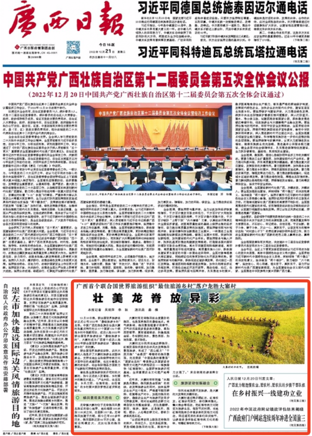 12月20日晚,联合国世界旅游组织正式公布2022年“最佳旅游乡村”名单。中国广西龙胜各族自治县大寨村和重庆荆竹村从57个国家136个候选乡村中脱颖而出,成功入选2022年联合国世界旅游组织“最佳旅游乡村”,大寨村成为广西首个成功入选2022年联合国世界旅游组织“最佳旅游乡村”的村寨。