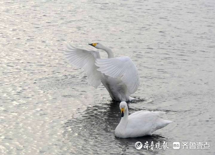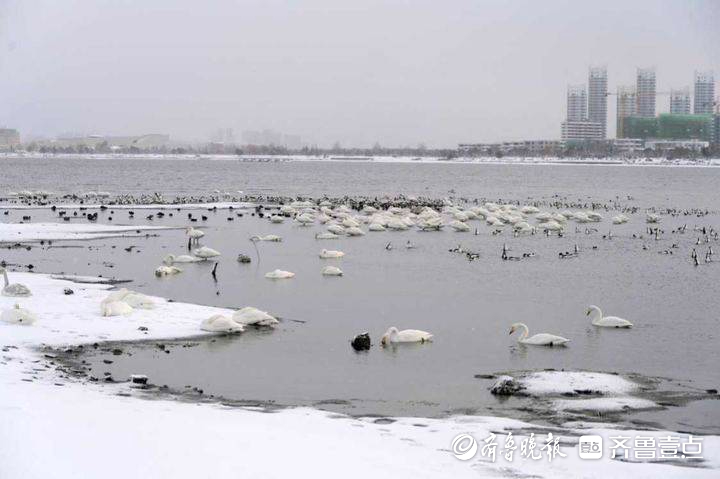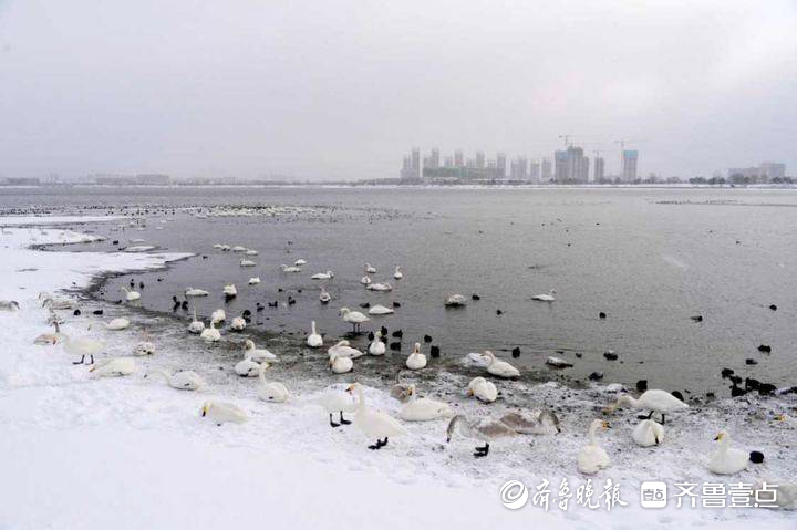 山东半岛近日暴雪,荣成市海滨白雪皑皑,大天鹅也很适应这种天气。
