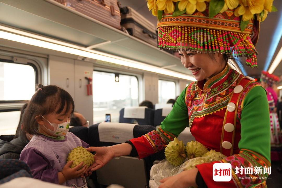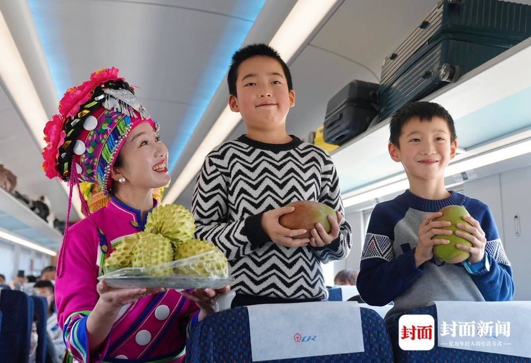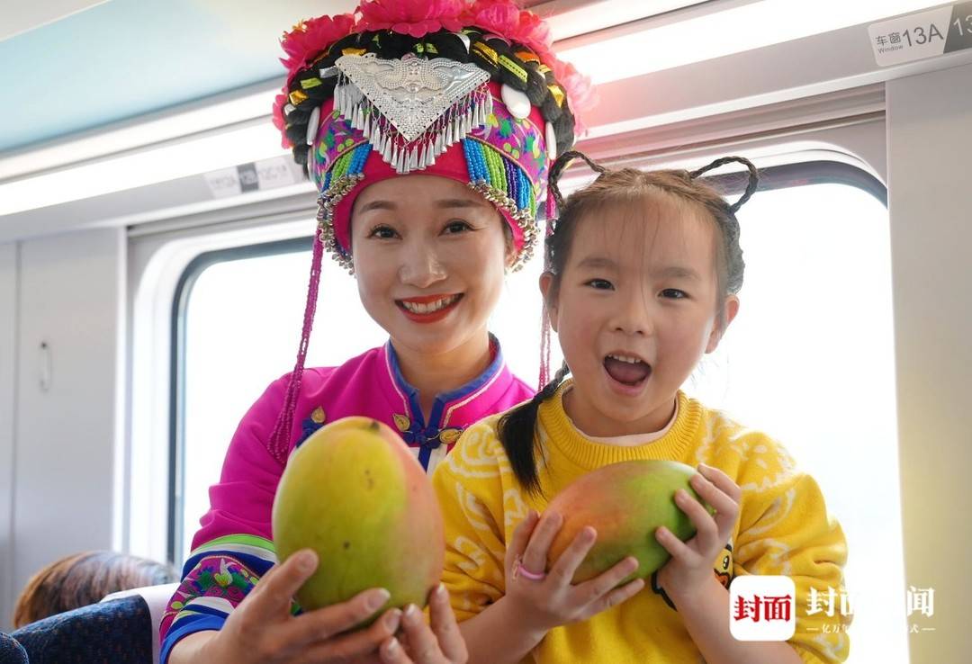 ▲为乘客送上攀枝花特产——芒果。