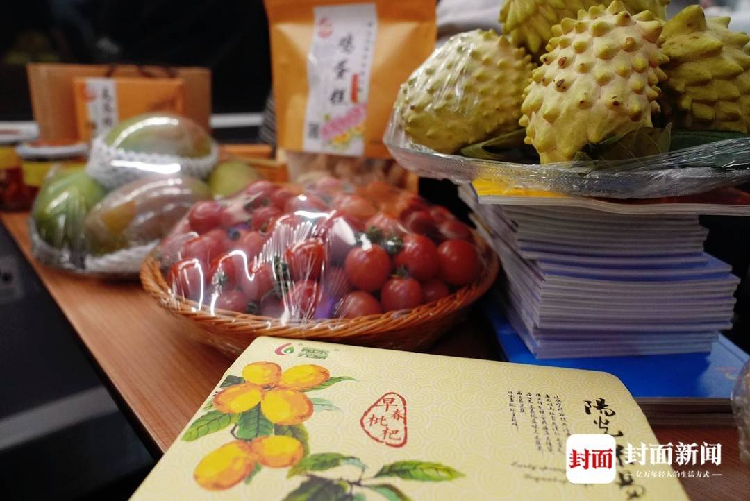 ▲成都直达攀枝花首发列车上,摆放着攀枝花当地特产。