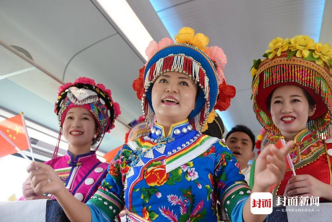 ▲攀枝花市米易县傈僳族的表演人员在动车上载歌载舞,庆祝新成昆铁路运营通车。