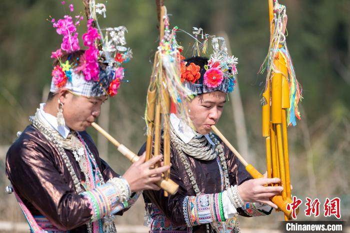 在贵州省从江县谷坪乡山岗苗寨,苗族同胞在吹芦笙。 吴德军摄