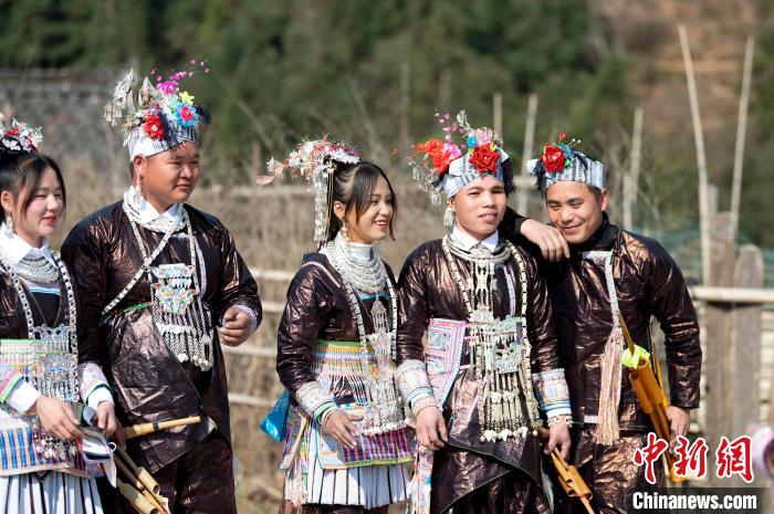 在贵州省从江县谷坪乡山岗苗寨,苗族男女青年在合影。 吴德军摄
