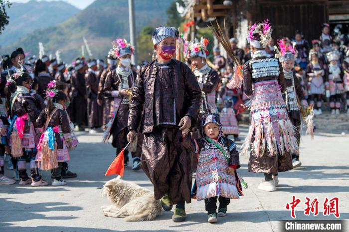 在贵州省从江县谷坪乡山岗苗寨,苗族芦笙手穿戴的百鸟衣。 吴德军摄