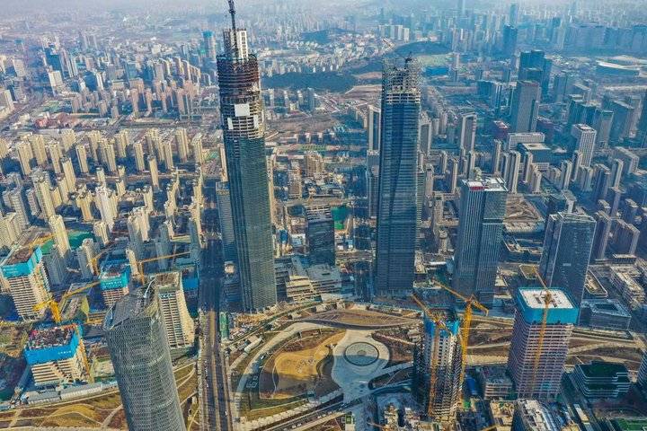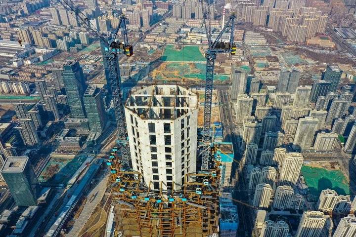 1月2日,航拍在建的济南CBD片区。灿烂的冬日阳光下,一座座高层、超高层建筑物拔地而起,远远望去仿佛巨型森林。