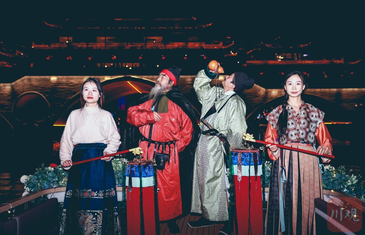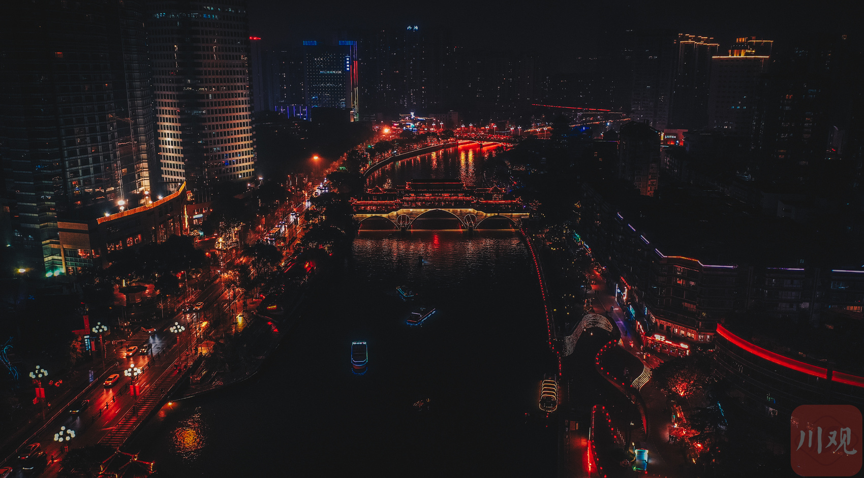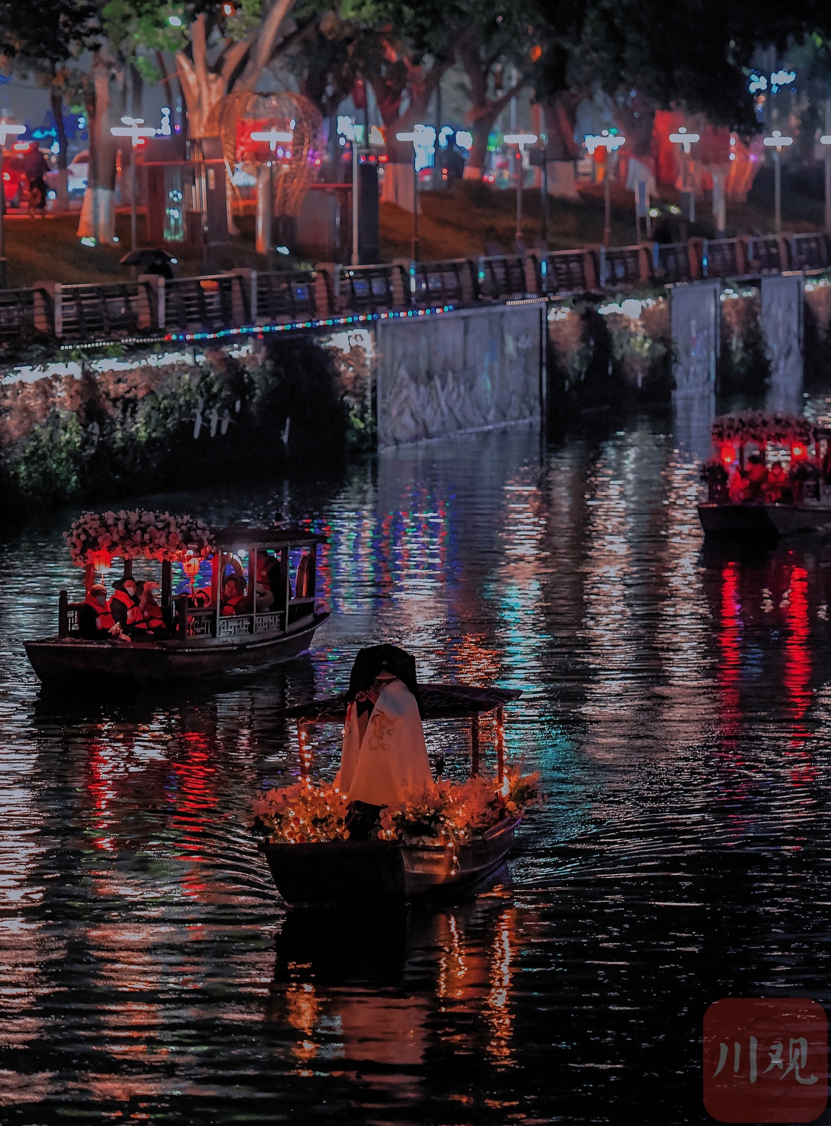 锦江边上,各式灯光布景交相辉映,处处流光溢彩、火树银花。市民成群结队登上小船去丈量这座城市的人文故事,品味独属于成都的城市气质。