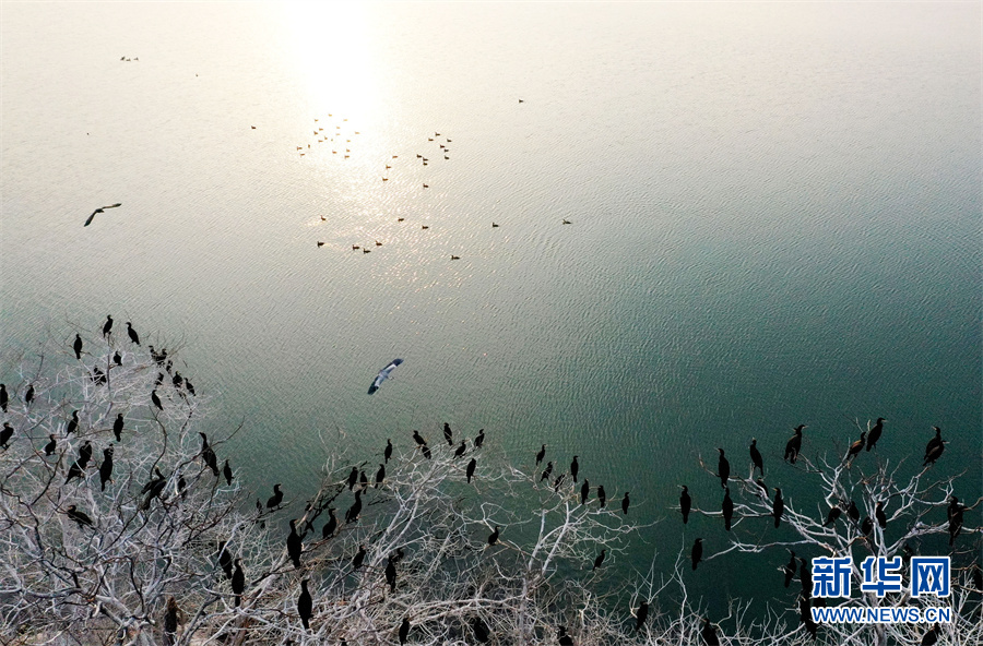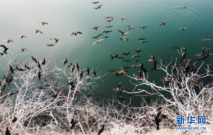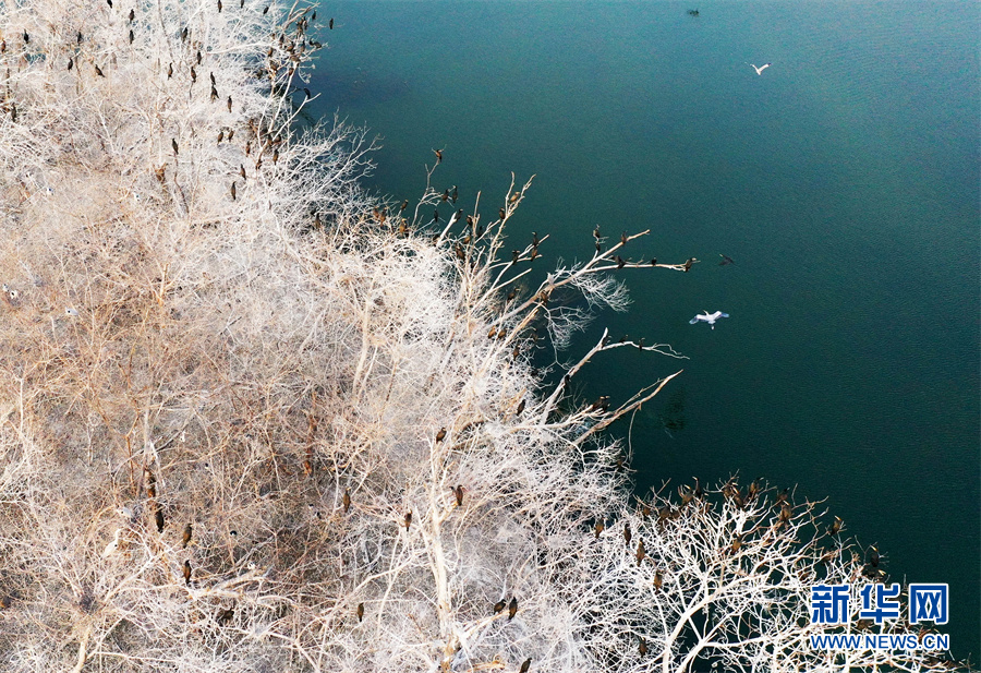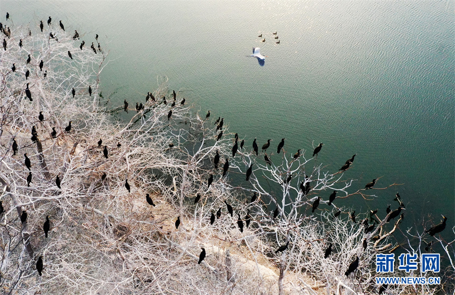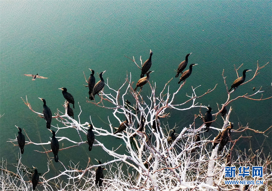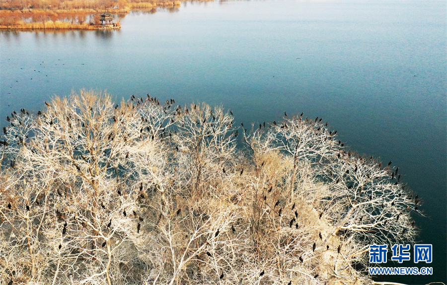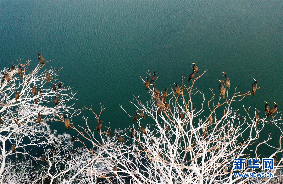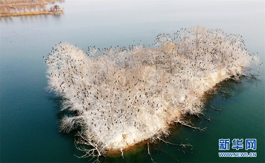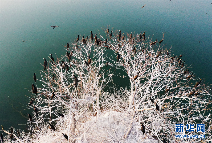 2023年1月2日,在安徽省淮北市南湖国家湿地公园鸟岛上,众多野生鸬鹚云集枝头,栖居于碧水之间,构成一幅美丽的生态画卷。
