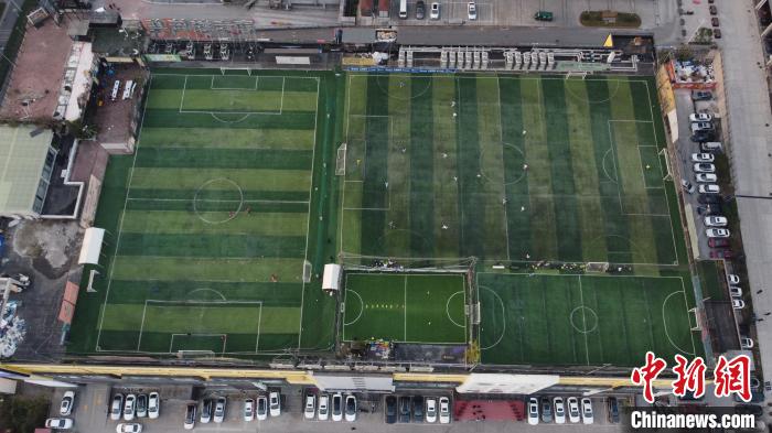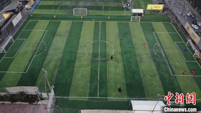 图为足球运动爱好者在楼顶球场踢球。 肖江川摄