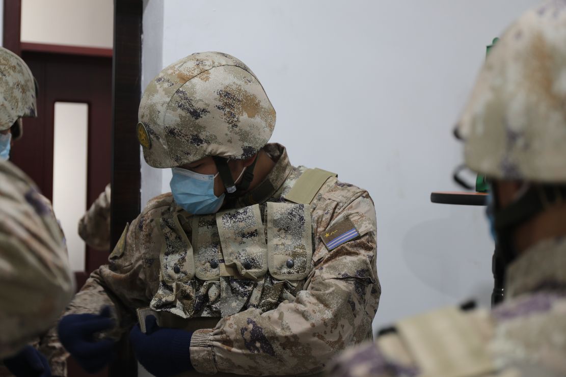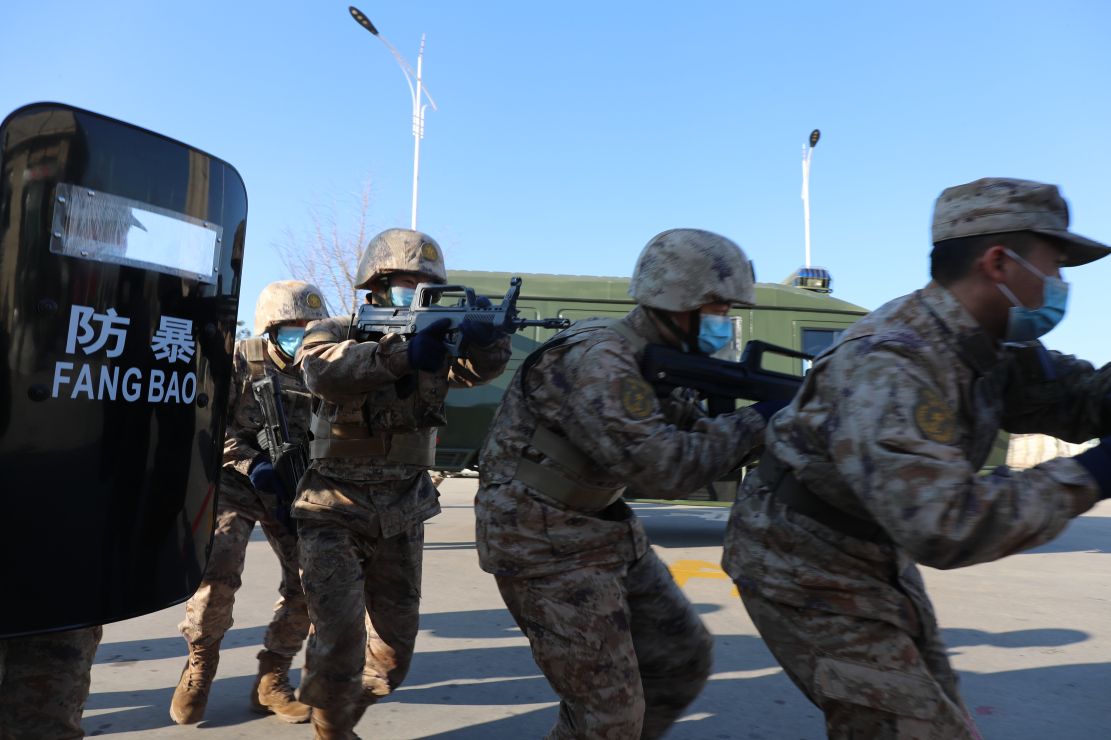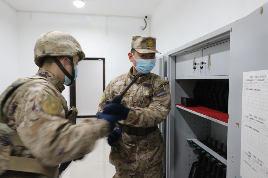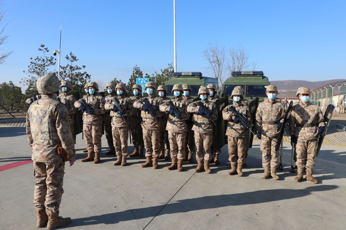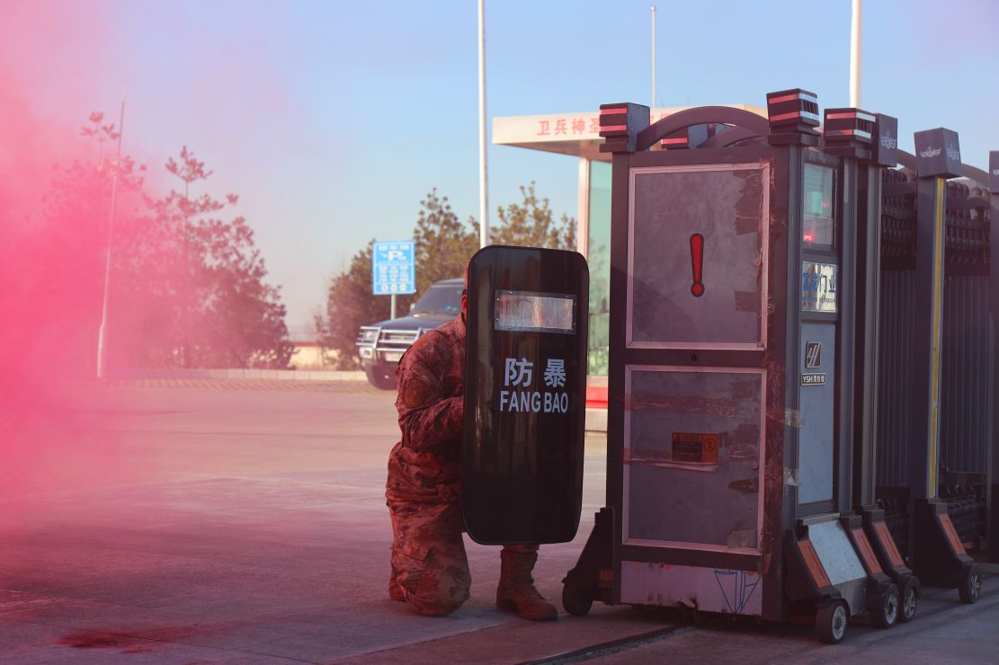 “二号门岗应急,1名持刀、1名持枪,正在向门岗靠近,请求应急分队支援。”该场站警卫连值班员接到门岗哨兵的特情报告后,迅速拉响应紧急出动警报,组织部队紧急集合。应急分队成员迅速集合,领取枪械、盾牌等防暴器具,火速登车前往特情发生地点。