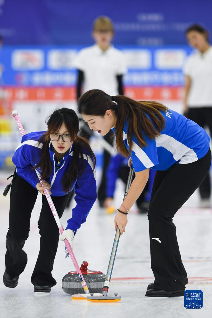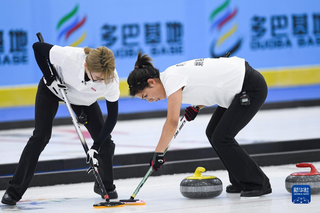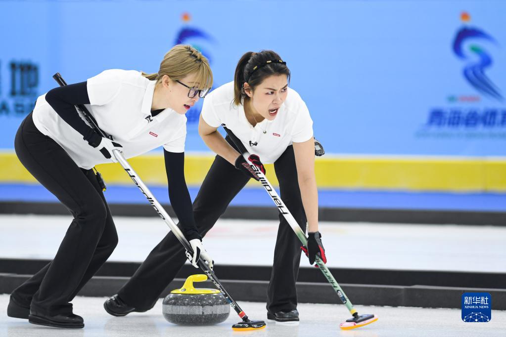 1月12日,黑龙江队队员叶紫萱(右)在比赛中擦冰。新华社记者吴刚摄