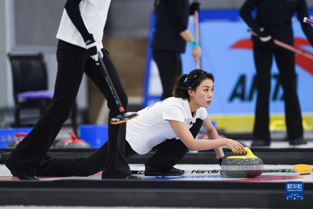 1月12日,哈尔滨队队员姚茗悦在比赛中掷壶。新华社记者吴刚摄