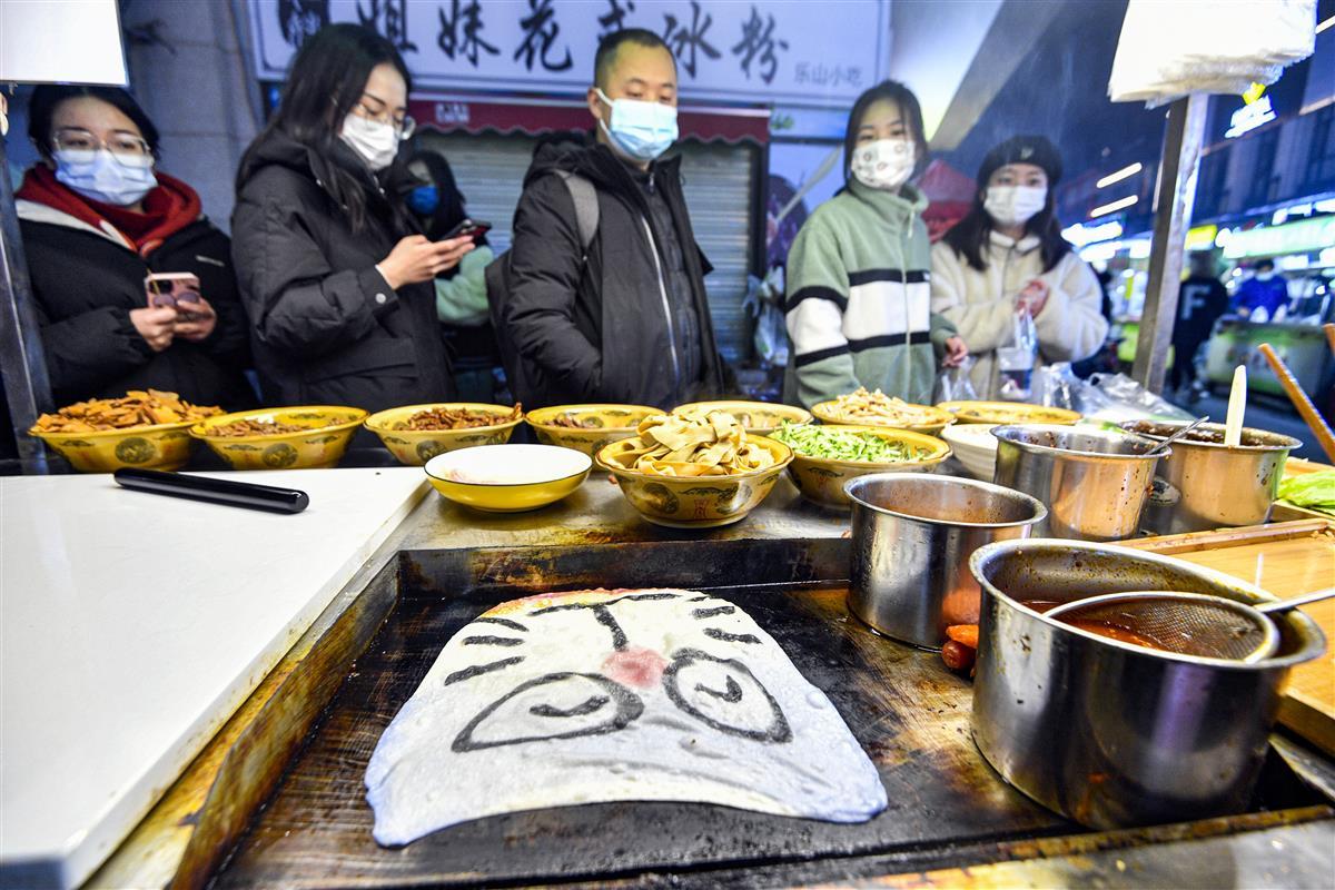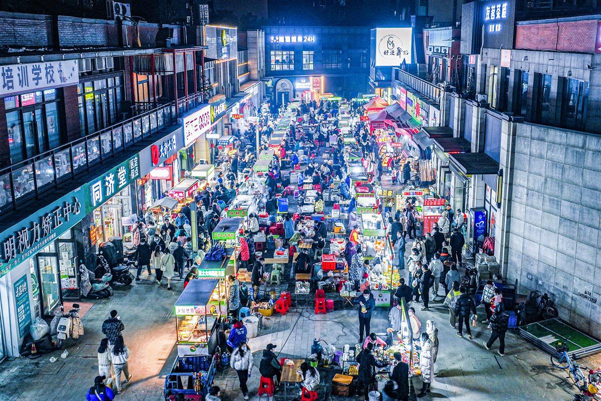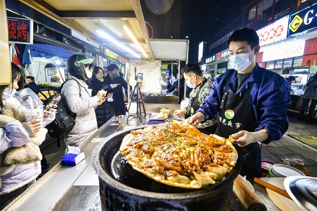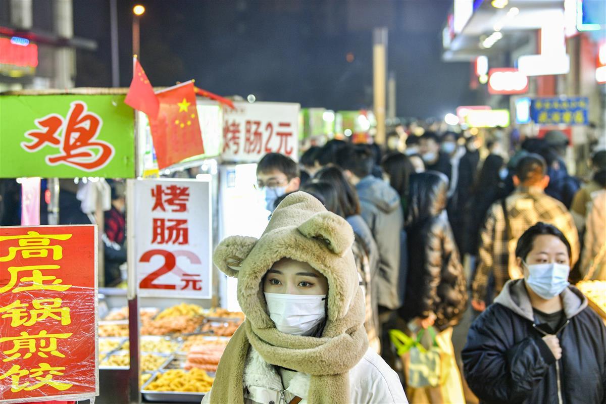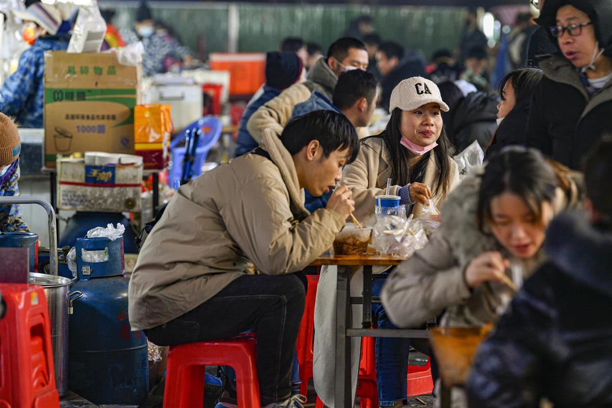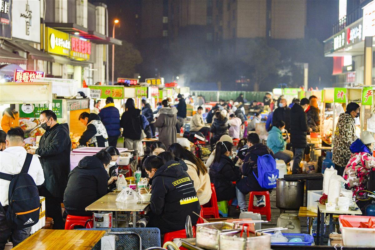 1月13日,夜幕降临,武汉光谷关山大道和民族大道之间的雄庄路上,人声车流喧嚣,雄庄路迎来了一天中最忙碌的时刻。该路一侧支路上的曙光夜市,人流如织,烟火蒸腾。冬夜里,曙光夜市烟火气越夜越沸腾。