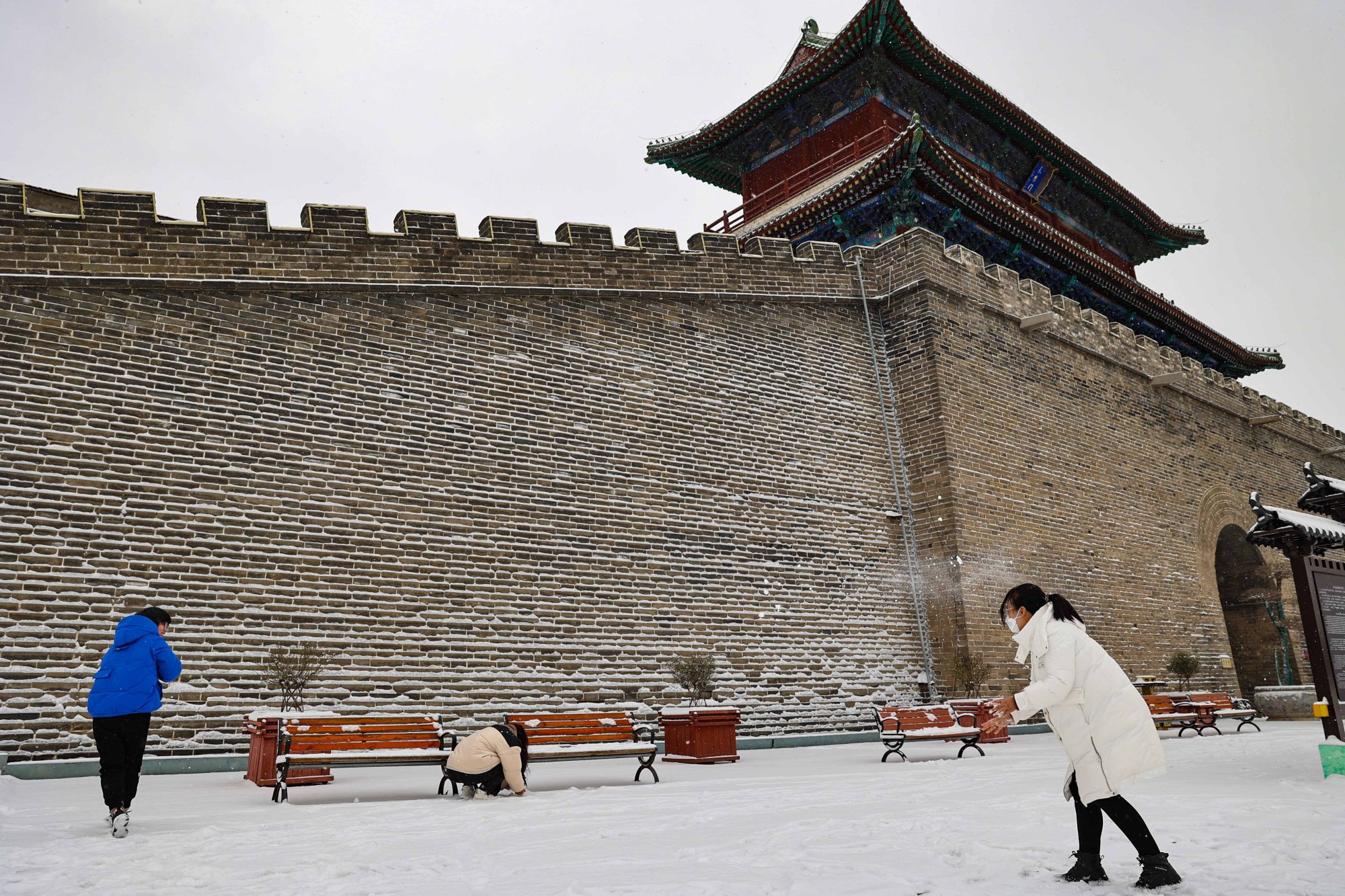 游客在正定古城内打雪仗(央广网见习记者王伟倩摄)