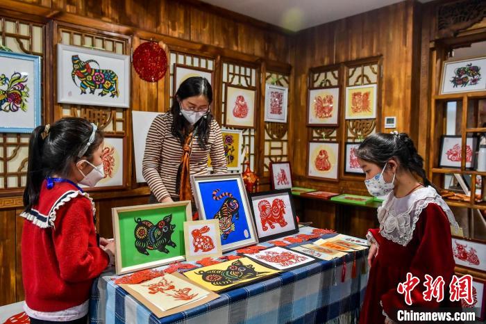 非遗展示区的剪纸作品吸引小朋友围观。 刘新摄