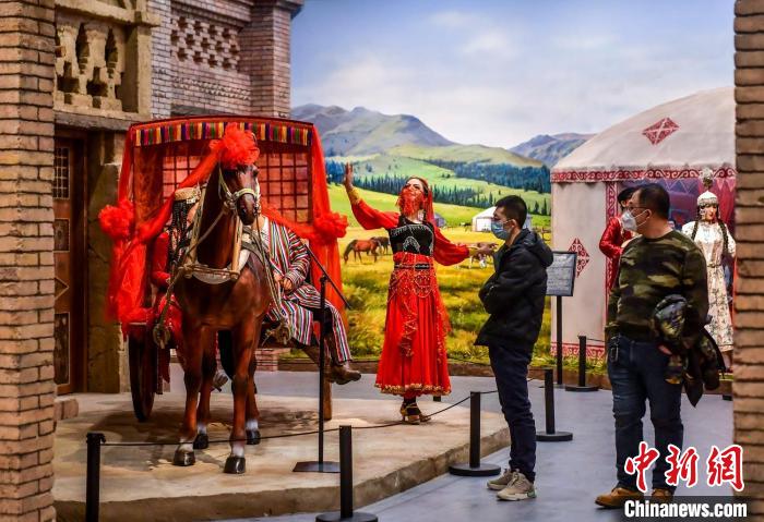 《非物质文化遗产》展厅,参观市民被惟妙惟肖的维吾尔族婚俗场景所吸引。 刘新摄