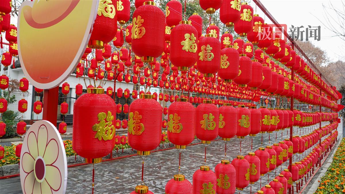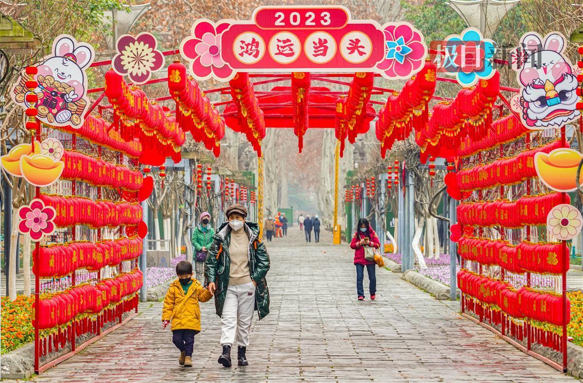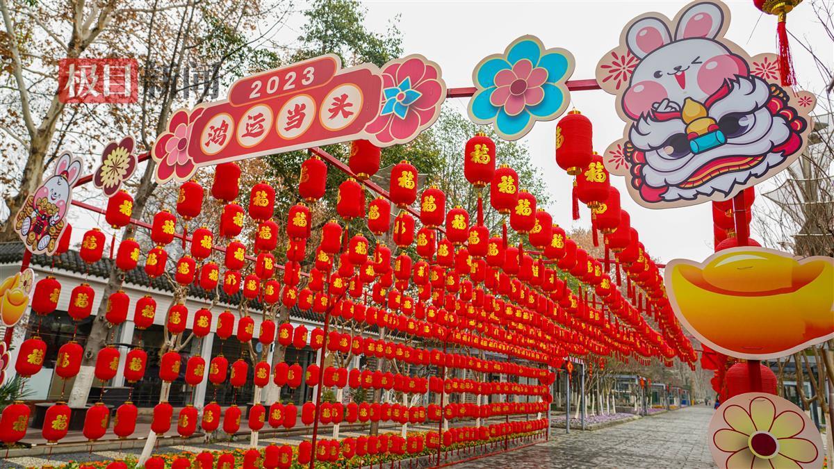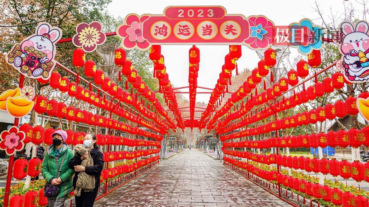 挂灯笼,年味浓。武汉解放公园1号门前,就有一处喜庆的红灯笼长廊,迎接游客们的到来,上书“2023鸿运当头”,每个灯笼上都写有“福”字,祝福满满,还有中国结等元素,一派喜气洋洋,如此浓烈的过年氛围,吸引游客们纷纷打卡。