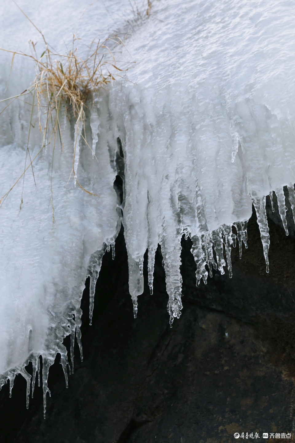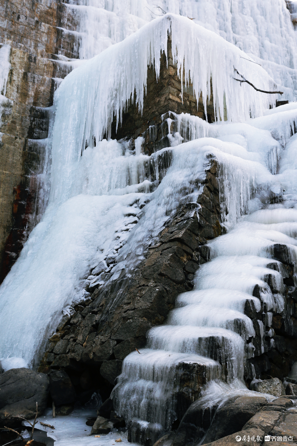 冰挂下依然能听见水流奔涌的声音,冰瀑十分厚实,层层叠叠的冰笋冰凌不断累积,将瀑布一泻千里的姿态定格,保留住了它雷霆万钧的气势,连水坝旁边的阶梯也如冰雕玉砌一般,站在这一幕冰瀑前仿佛置身冰雪世界,让人不得不感叹大自然的鬼斧神工。