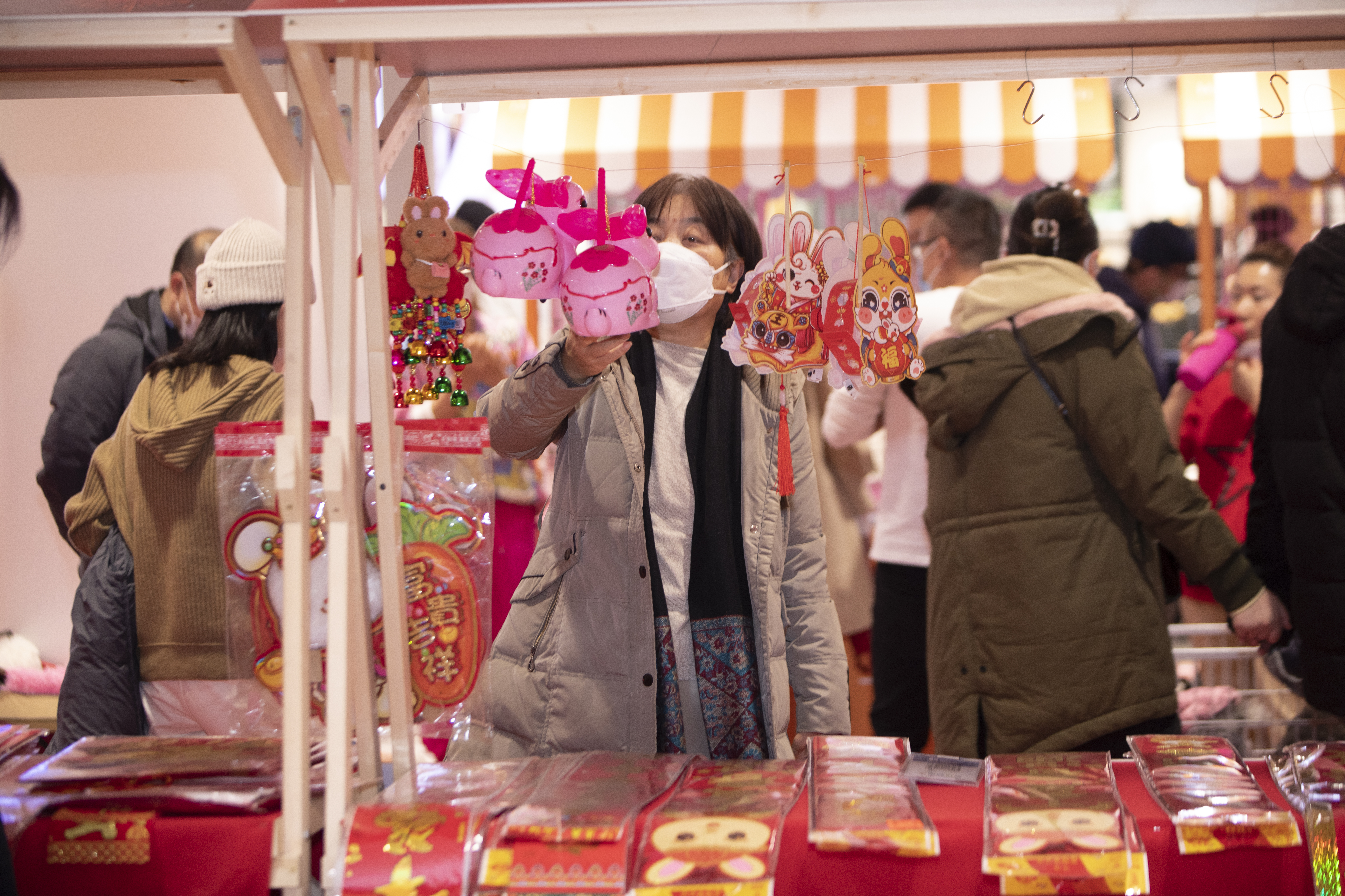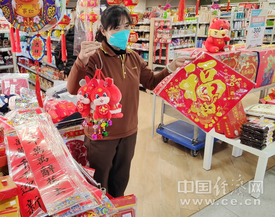 春节将近,年味愈浓。北京市各大商场已开启春节模式,市集红红火火,对联、福字、兔子娃娃等年货一应俱全,食品、日用品等备货充足,现场消费者人头攒动。