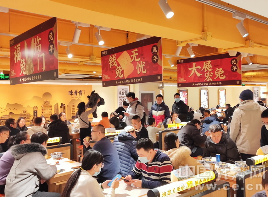 2023年1月12日,北京百盛购物中心内某餐厅座无虚席,餐厅内悬挂“福兔临门”“钱兔无忧”“大展宏兔”等祝福条语。中国经济网记者李冬阳/摄