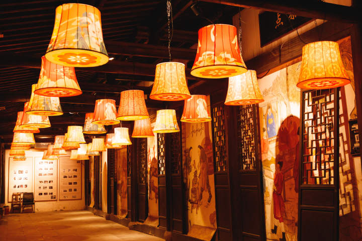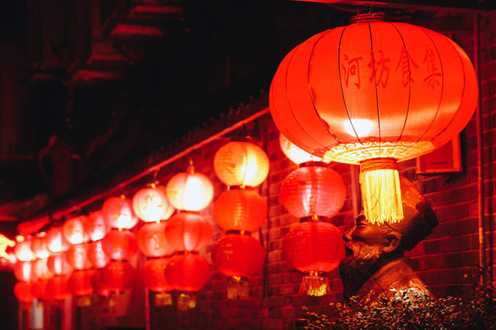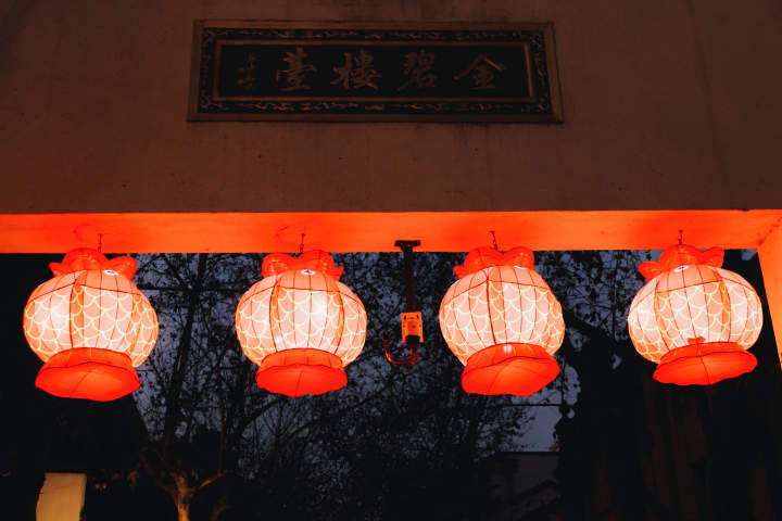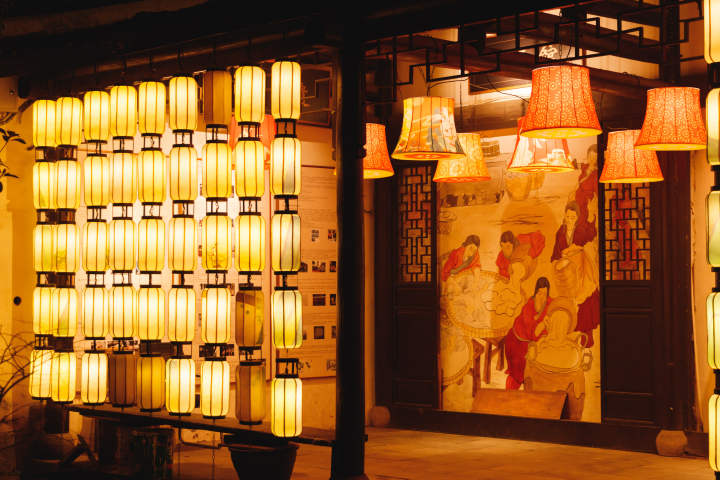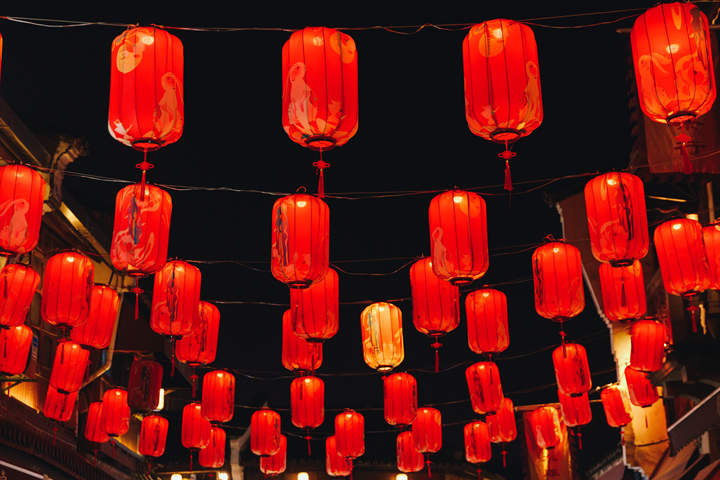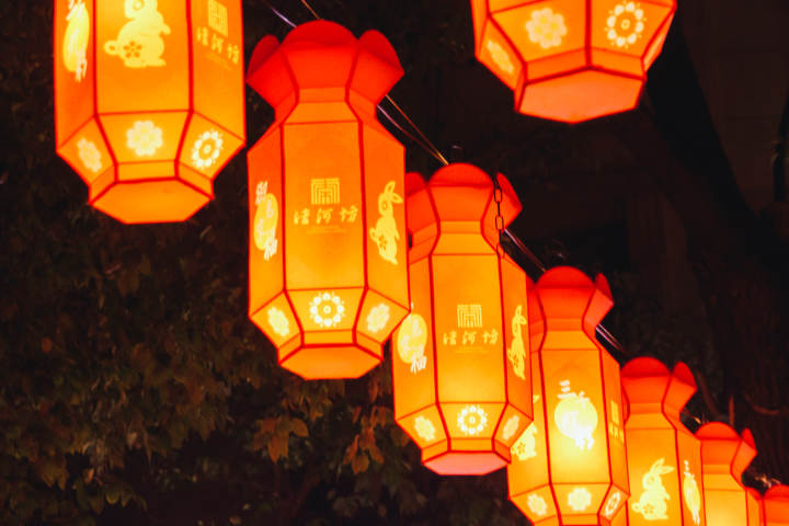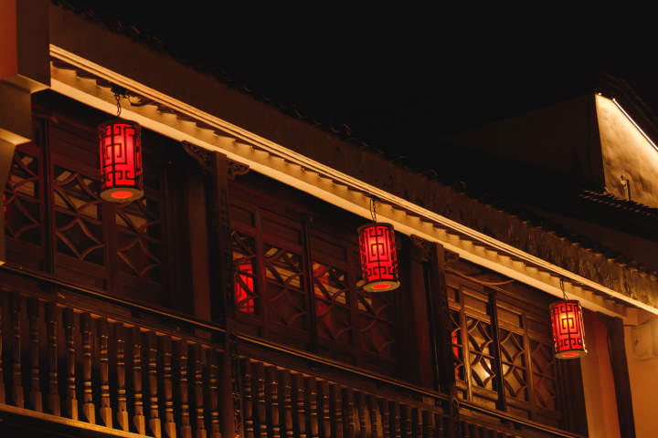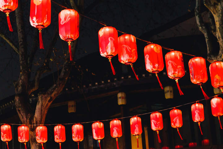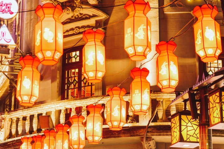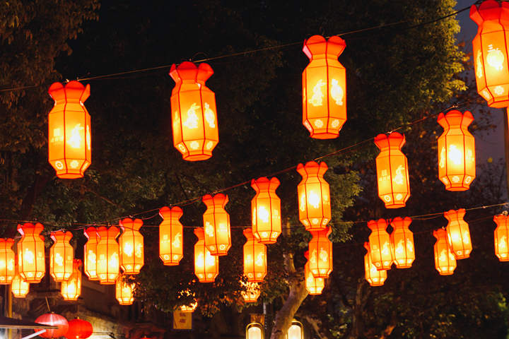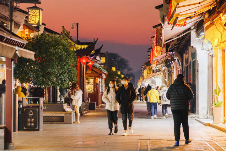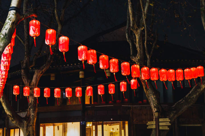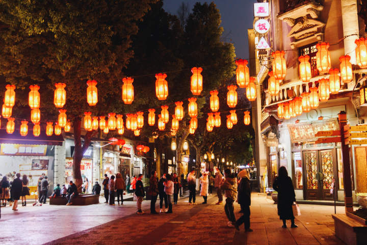 借由两宋文化与国风的兴起,街区两侧张灯结彩,挂满了各式各样的灯笼。