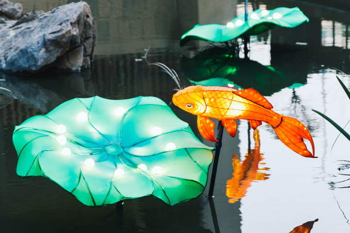 有的以生肖兔为创作题材,融合祥云、山水等元素,在一朵灯花中呈现清河坊特色的鼓楼、牌坊;有的以花月为引、玉兔为伴,诉说的是文人墨客的清谈和雅量;还有的以锦鲤、元宝为造型,寓意年年有余、财源广进。