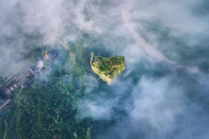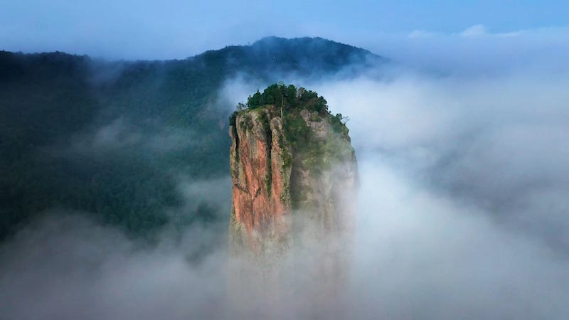 鼎湖峰是令人叹为观止的地质奇观。鼎湖峰是火山流纹岩地貌的典型代表,据地质学家考证,它是1亿年前由火山喷发堆积形成的流纹岩台地,本与后面的步虚山连为一体,经后期的地壳抬升、流水冲蚀、风化剥蚀和重力崩塌等外力作用,才慢慢地分离开来,形成如今的柱峰奇观。鼎湖峰相对高度170.8米,顶部面积710平方米,底部面积2468平方米,是我国已知最高的火山岩单体柱峰。从航拍视角来看,“心”字形的峰顶上,巉岩参差,植被丰茂,自成独立的生态系统。