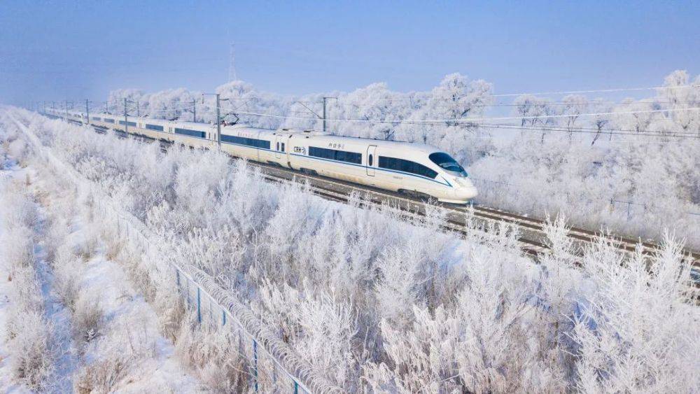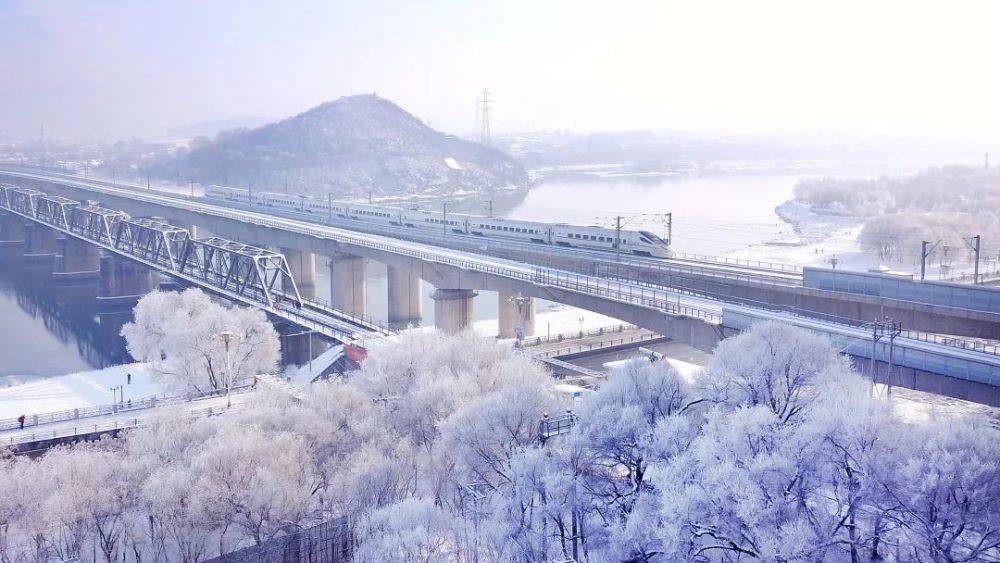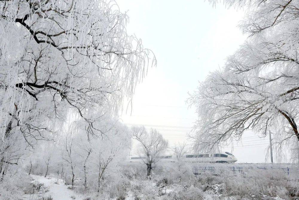 途经吉林站的高铁列车在挂满雾凇的丛林中飞速穿行,银白色的车身与林海冰花交相辉映,亦是绝美的风景。