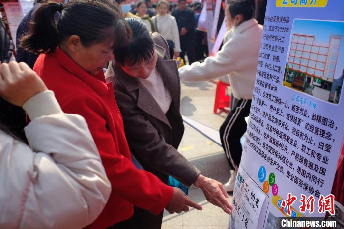 图为两名应聘者正在了解一家企业的简介。 刘俊聪摄