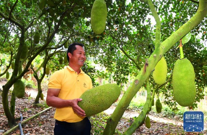 ↑海南省三亚市育才生态区那受村农户苏正荣展示采摘的菠萝蜜(2月2日摄)。新华社记者赵颖全摄