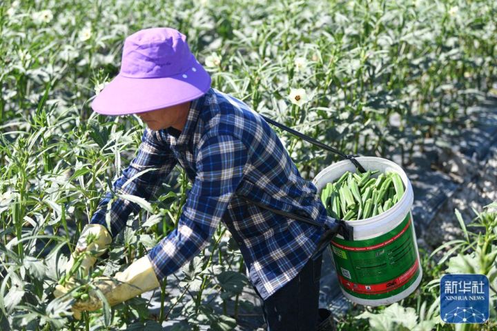 ↑农民在海南省三亚市天涯区的农田采收秋葵(2月1日摄)。新华社记者蒲晓旭摄