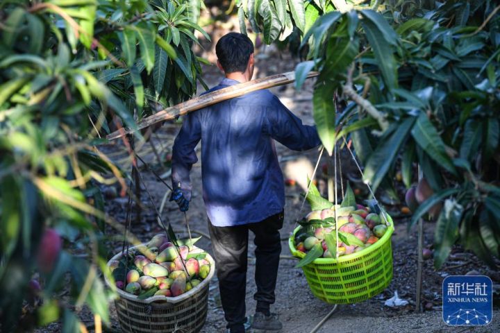 ↑在海南省三亚市育才生态区芒果园,农民在转运采收的芒果(2月1日摄)。新华社记者蒲晓旭摄