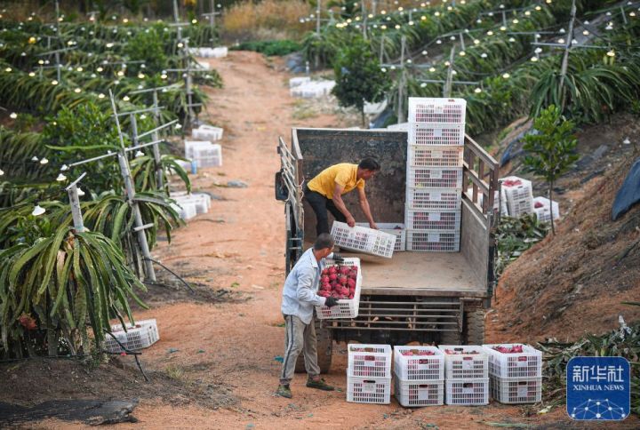 ↑在海南省三亚市育才生态区“水果岛”火龙果基地,人们将采收的火龙果装车(2月1日摄)。新华社记者蒲晓旭摄