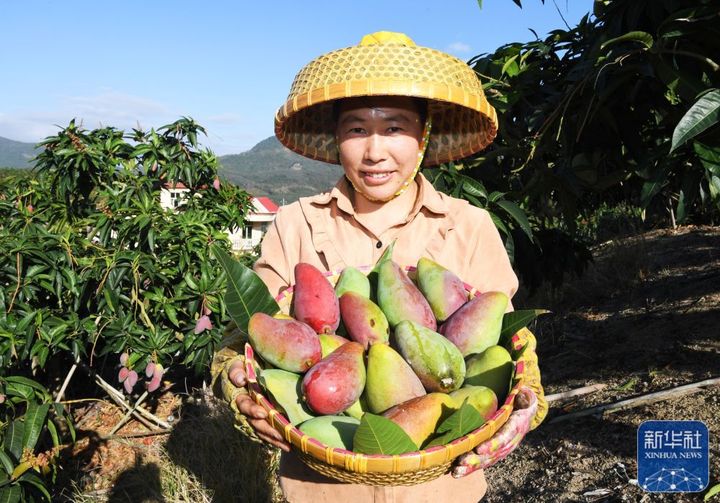 ↑海南省三亚市育才生态区芒果园的工人杨秀英展示采摘的芒果(2月1日摄)。新华社记者赵颖全摄