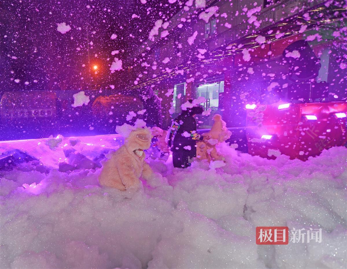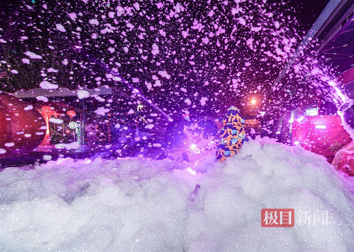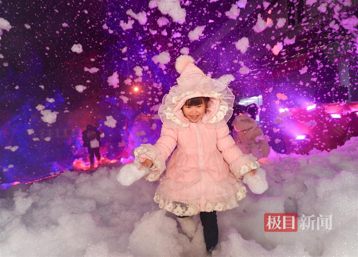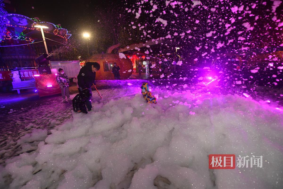 2月5日晚,在武汉市青山区和平公园,无数的泡泡从泡泡机里奔涌而出,漫天飞舞,随后缓缓落下,地上一片洁白。小朋友们仿佛置身大雪纷飞的童话世界,他们或捧着双手接住缓缓落下的泡泡,或用力踏上泡泡集成的小丘,尖叫声欢笑声响成一片。