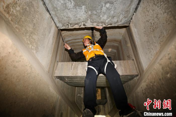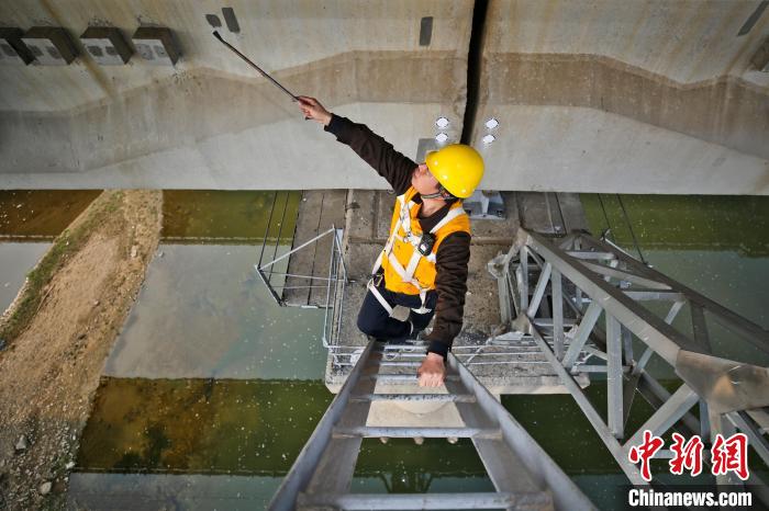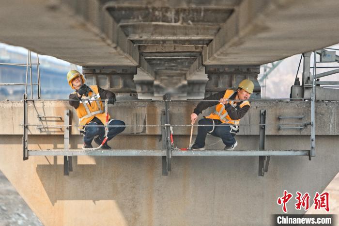 图为铁路职工攀爬在铁路桥梁上进行检测维护作业。 张中海摄