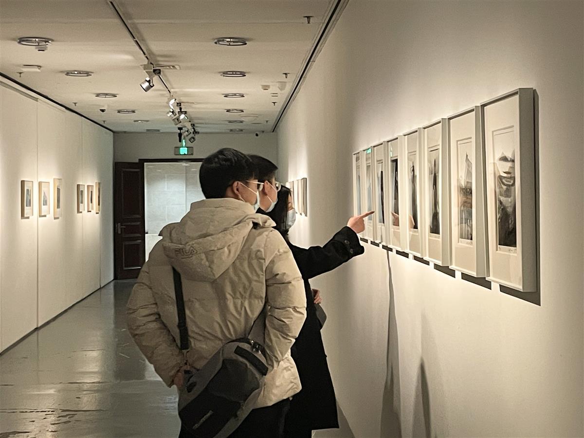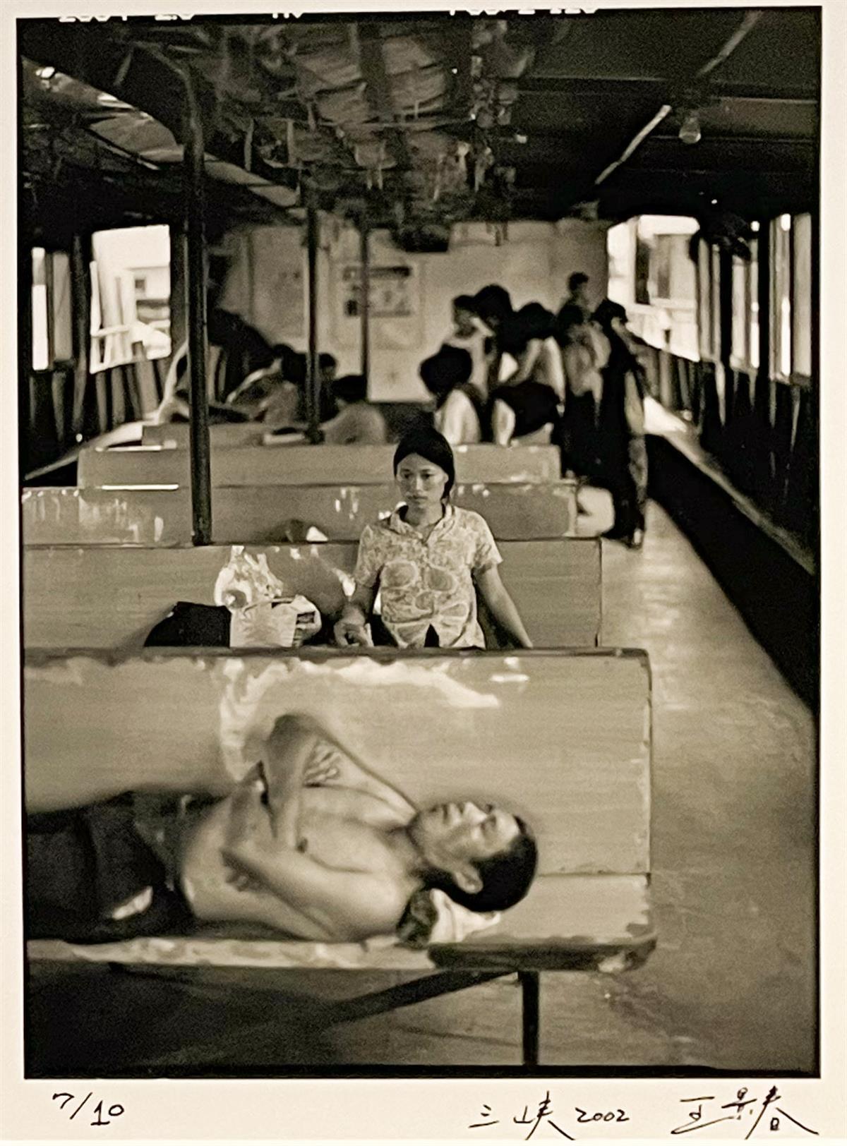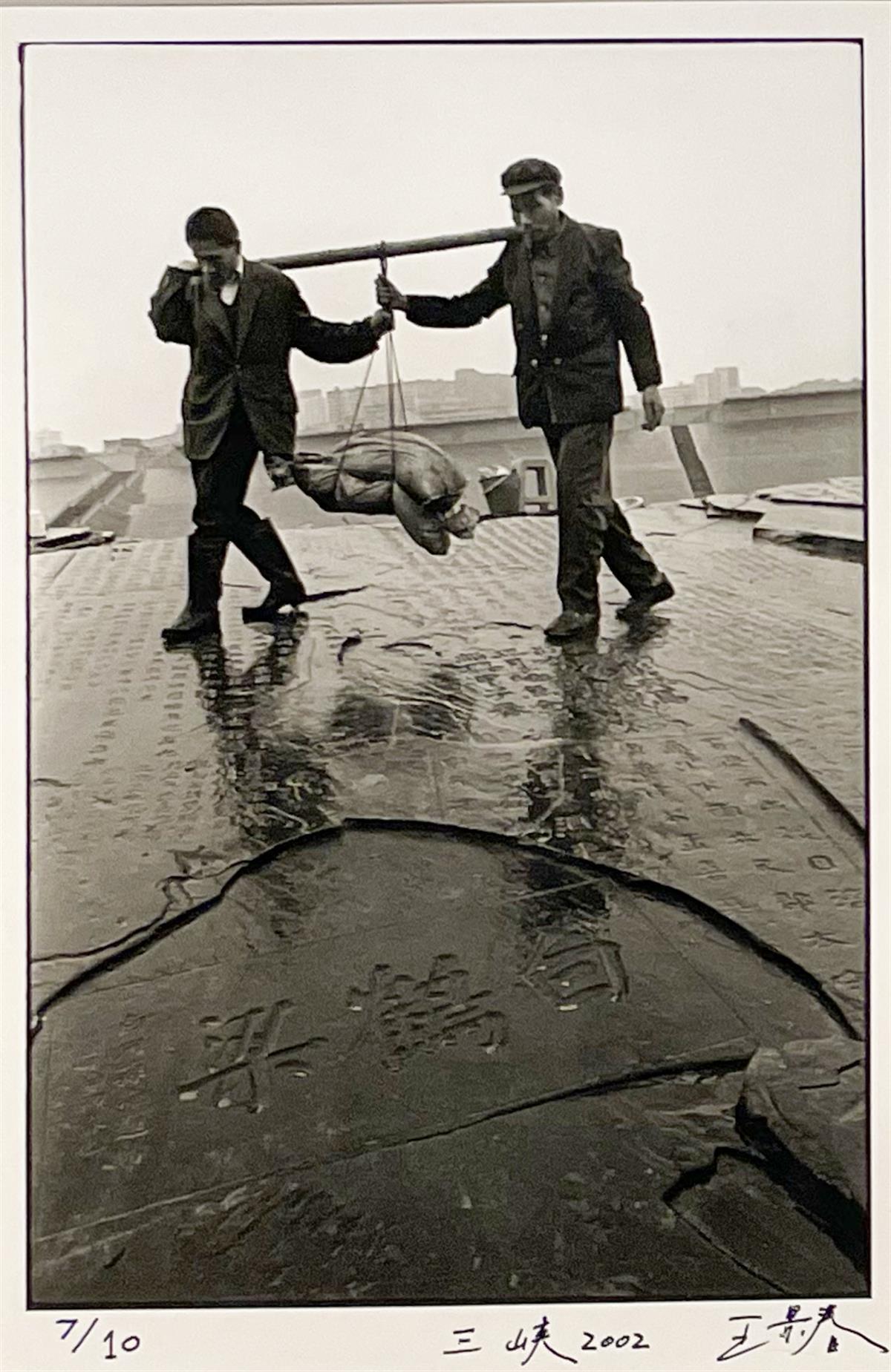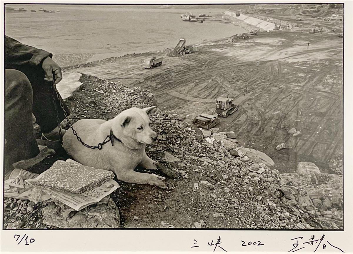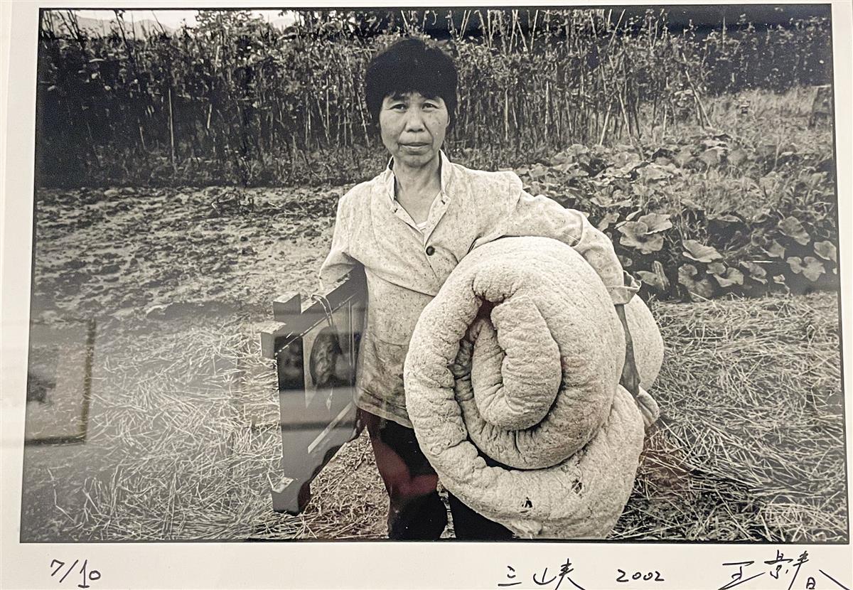这组名为《涓滴与洪流王景春的水世界》的人文纪实摄影吸引了众多参观者。在展出的作品中,15幅作品于2002年和2003年拍摄于三峡:田地边,一中年妇女抱着老人遗像;长江边,爷爷坐在石头上休息,一条狗温顺地趴在一旁;长江上,两男子抬着水泥修建白鹤梁水下博物馆;背靠大江,一男子弹着琵琶一男子吹着笛子;候船厅里,一女子带着大包小包去远方......