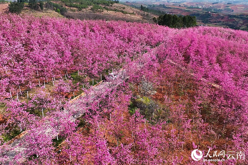 人民网昆明2月15日电(记者李发兴)近日,云南省昆明市宜良县山后樱花谷的上千亩樱花进入盛放期,姹紫嫣红的花朵挂满枝头,浪漫绚丽的花海美不胜收。