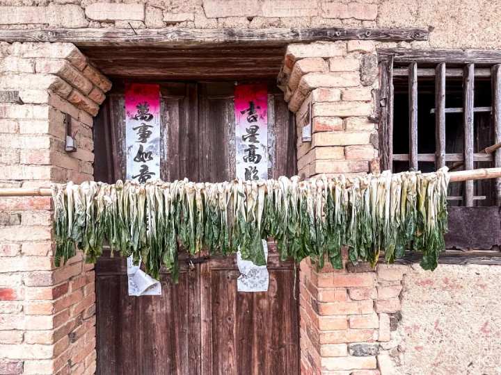 周小柚还发现,在村子的门前屋后,村民们正在晾晒青菜。一问才知这是一种被称为“捞汤菜”的当地美食,平时村民们用它来做炖汤。说起捞汤菜,不善言辞的鲍阿姨便兴冲冲地跑去,特意将她最新晒好的菜拿来展示给大家。她说,此时收割的青菜由于受过冬季低温霜打,晾晒之后便会特别的甜。