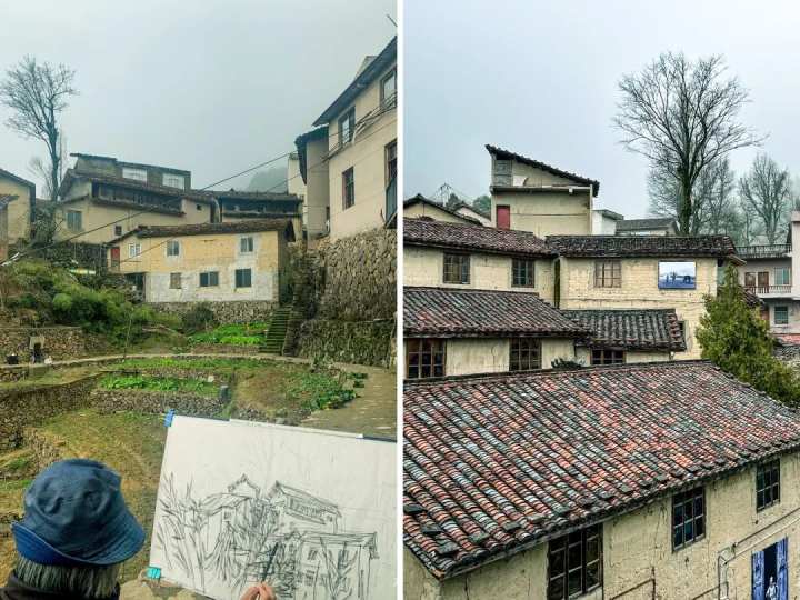 我们走上山去,正好遇到了三位正在写生的画家,一听口音便得知他们从北方而来,因为对江南的向往,特意选择此时来西坑村记录这江南云雾之景。也正好,他们画中所描绘的就有二十四节气馆。