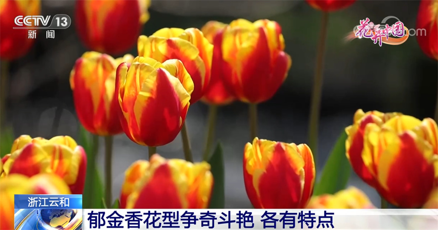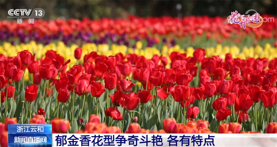 总台记者于晨:我现在就在云和县元和街道的郁金香花田,在我身旁,近20万株郁金香迎着春日暖阳竞相绽放,此时此刻每走一步,眼前都是绚烂的色彩,扑鼻的清香。从空中俯瞰,亭亭玉立的郁金香犹如一根根彩色水笔,肆意勾画出五彩斑斓的图案,又如一块巨大的花毯在浮云溪畔蔓延。花田、水车、溪流相映成趣,构成一幅充满诗意的画卷。