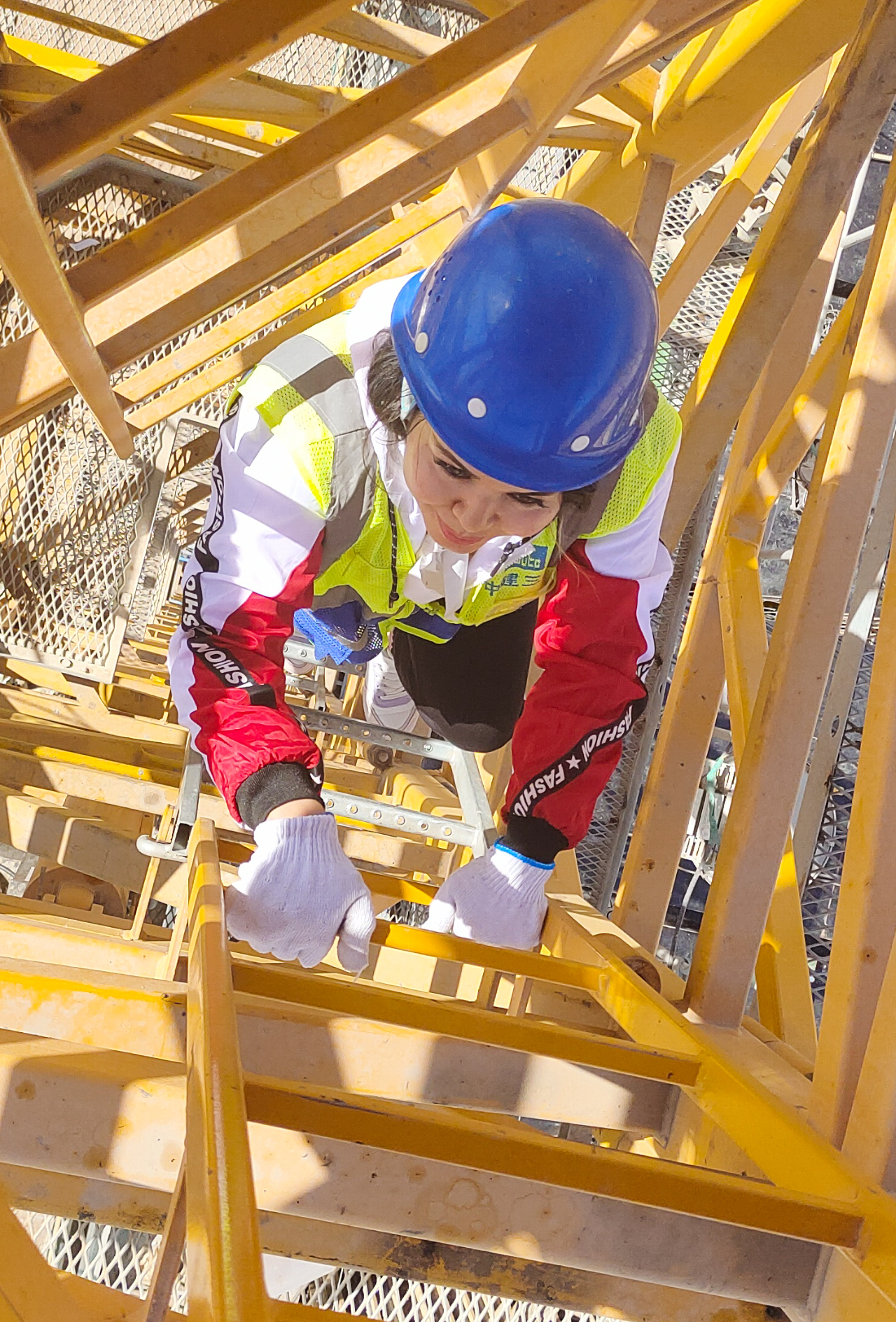今年27岁的古丽加玛丽·阿吉,是项目唯一的维吾尔族塔吊女司机。虽然年纪不大,但她从事这一行已有5年时间。在周围工友眼中,古丽加玛丽的业务水平和吃苦耐劳精神,不输工地上的男工友。