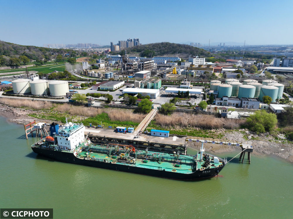 ↑2023年3月14日,安徽省芜湖市鸠江区长江南岸一处沥青码头,一艘货船靠泊在码头进行沥青卸船作业。(无人机照片)CICPHOTO/王玉实摄