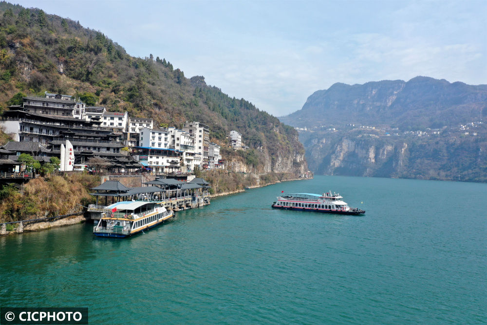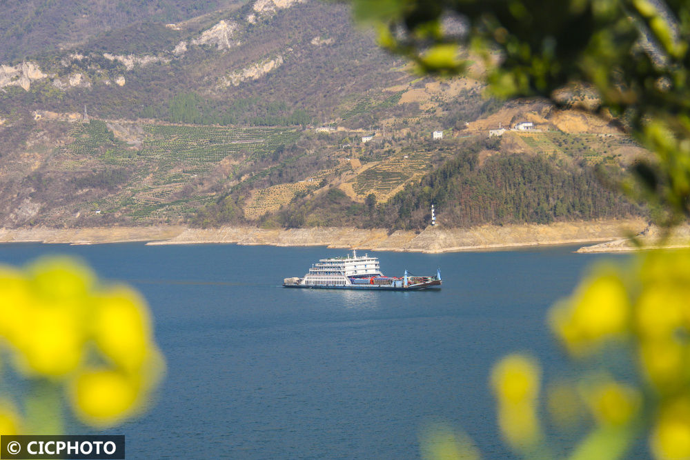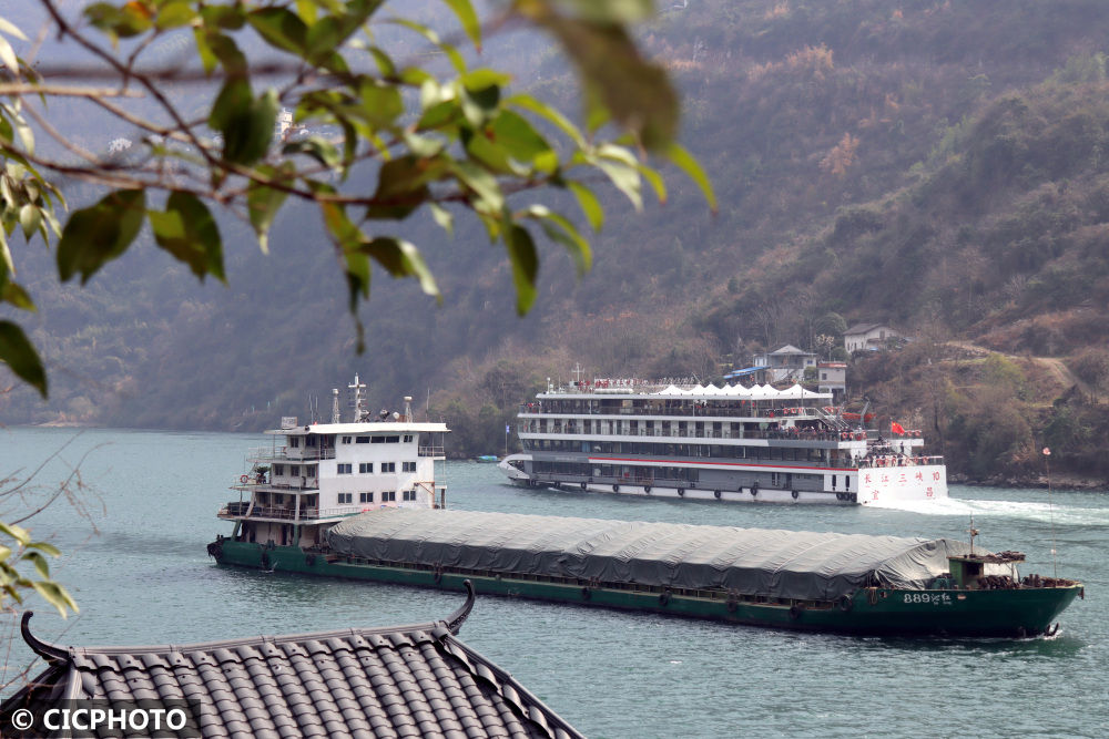 ↑2023年3月13日,船舶行驶在长江重庆市巫山县曲尺乡水域。CICPHOTO/卢先庆摄