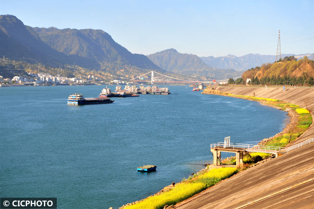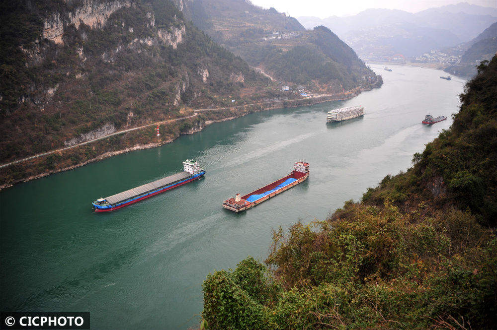 ↑2023年3月15日,船舶行驶在长江三峡湖北省宜昌市秭归县西陵峡水域。CICPHOTO/李峥摄