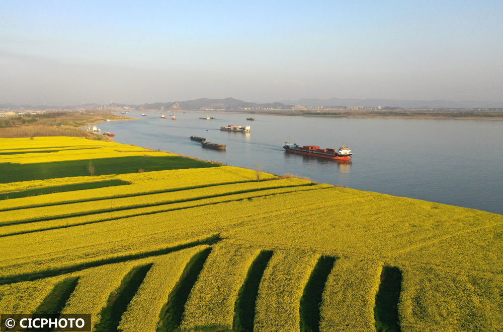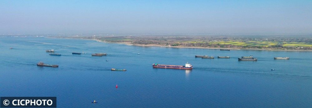 ↑2023年3月15日,船舶行驶在长江安徽省安庆市宿松县水域。(无人机照片)CICPHOTO/李龙摄