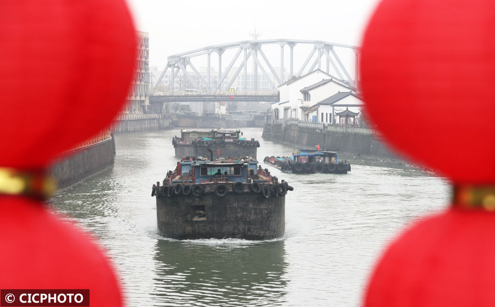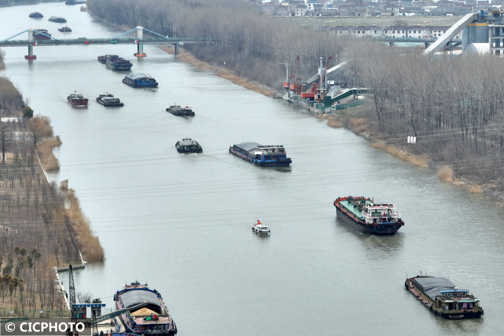 ↑2023年2月22日,货船行驶在京杭大运河江苏省扬州市宝应县水域。(无人机照片)CICPHOTO/沈冬兵摄