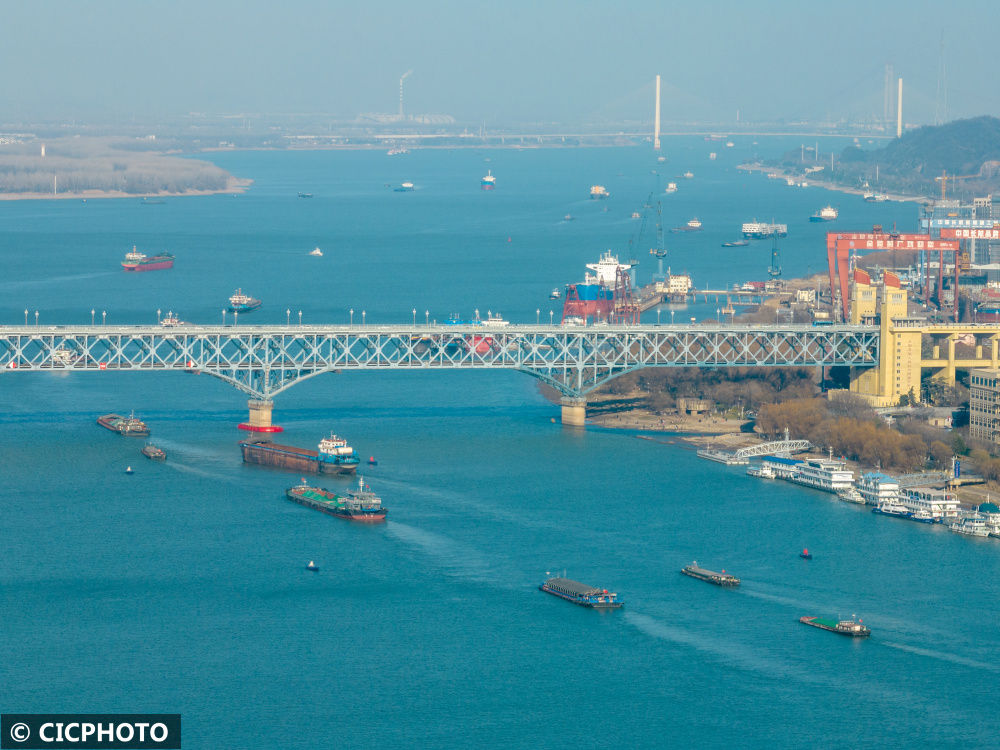 ↑2023年1月29日,船舶行驶在长江江苏省南京市水域。(无人机照片)CICPHOTO/杜懿摄