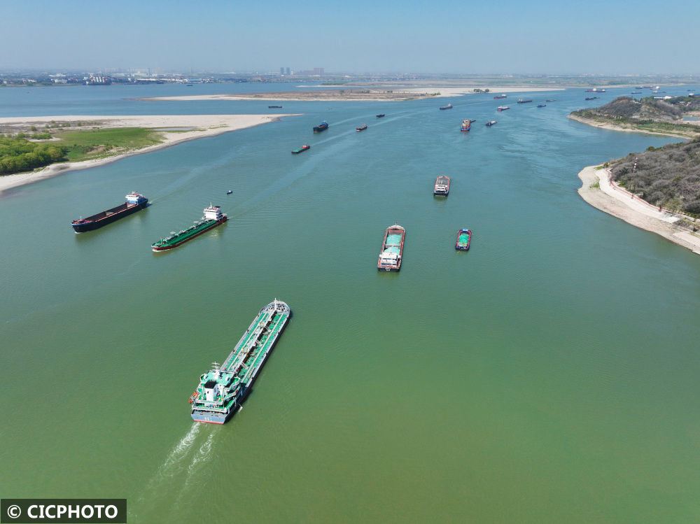 ↑2023年3月13日,船舶行驶在长江安徽省芜湖市繁昌县水域。(无人机照片)CICPHOTO/鲁君元摄